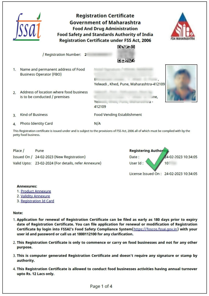 Once approved, you’ll receive your official FSSAI Registration Certificate/License and photo ID card with a 14-digit license number. This must be displayed at your food business premises. The approval process may take anywhere from 7 to 60 working days.